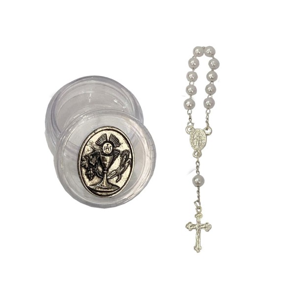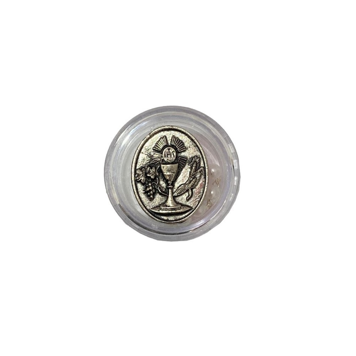 *Caixinha de Acrílico Primeira Eucaristia Níquel Envelhecido c/ Dezena - 3,7x1,7cm.