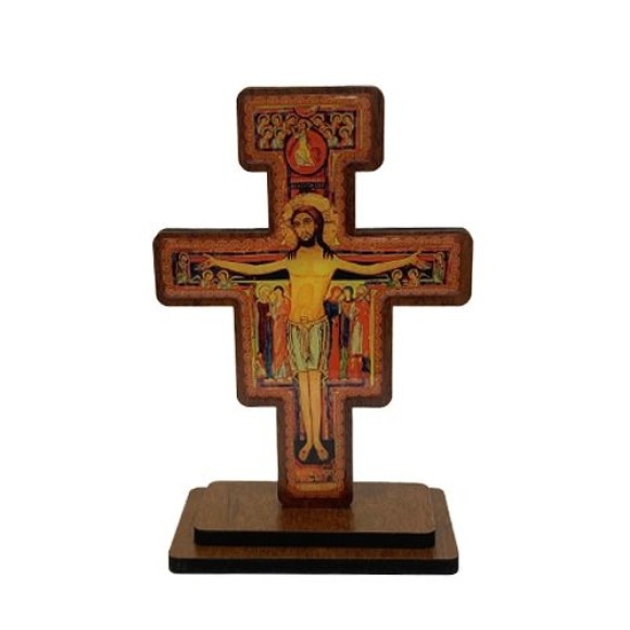 CU810815 - Crucifixo de Mesa São Damião Pedestal MDF Resinado - 17x10,5cm