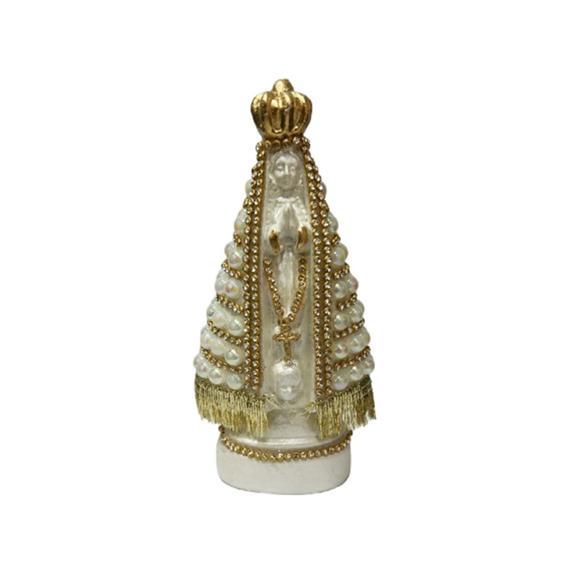 *Imagem N. Sra. Aparecida c/ Pérola Branca Furta-cor e Strass Dourada - 16x9cm.