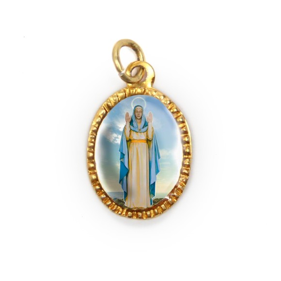 *Medalha de Alumínio Oval Dourada c/ 10un. N. Sra. Do Equilíbrio - 2X1,3cm.