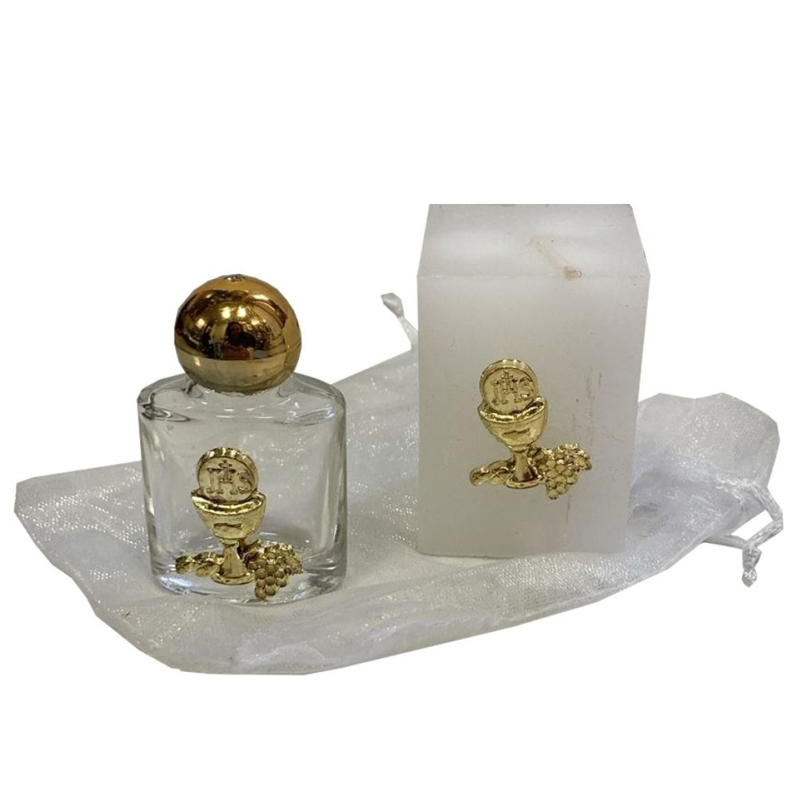 KT112500 - Kit Primeira Eucaristia c/ Vela e Garrafa de Água Benta - 10ml