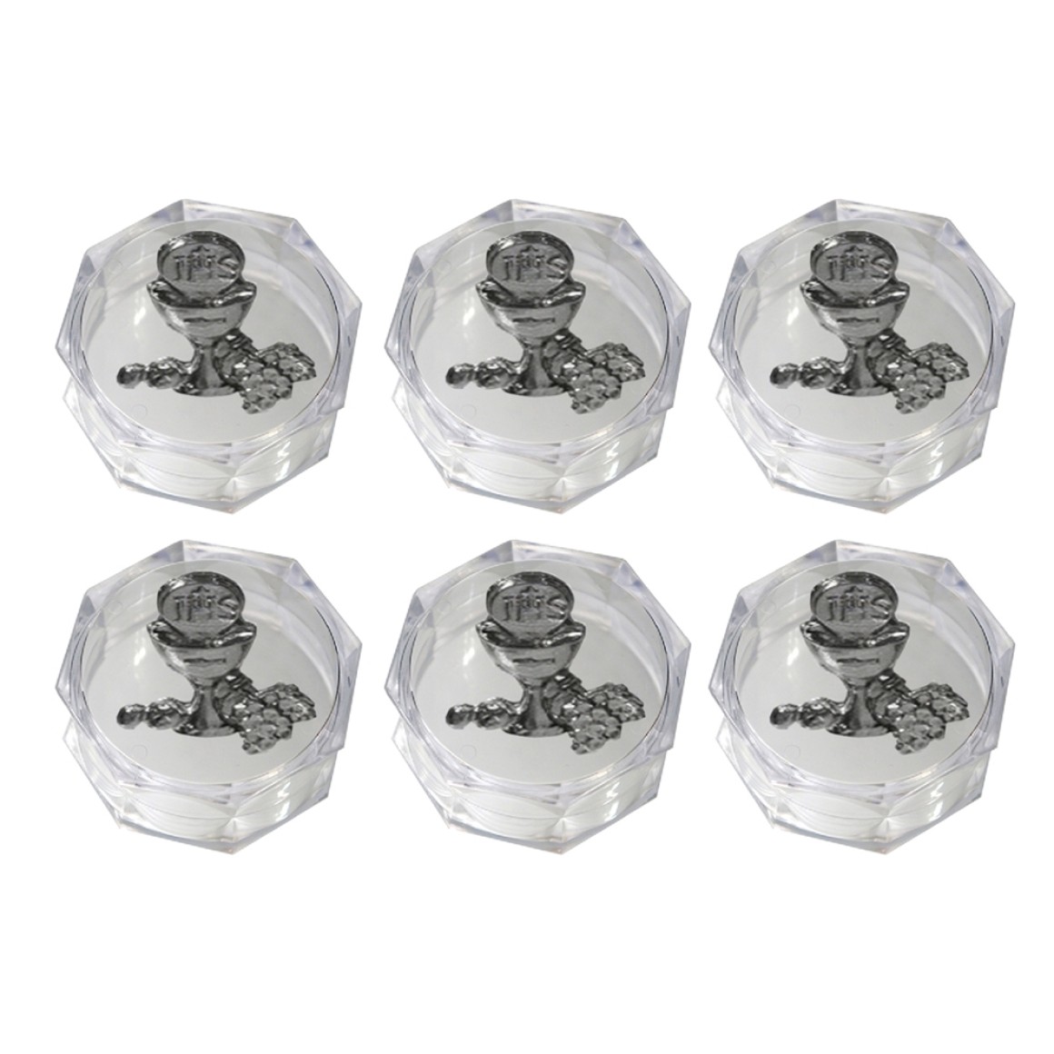 EM112005P6 - Caixa de Acrílico Sextavada c/ Medalha Primeira Eucaristia c/ 6un. - 3,5X3,5cm