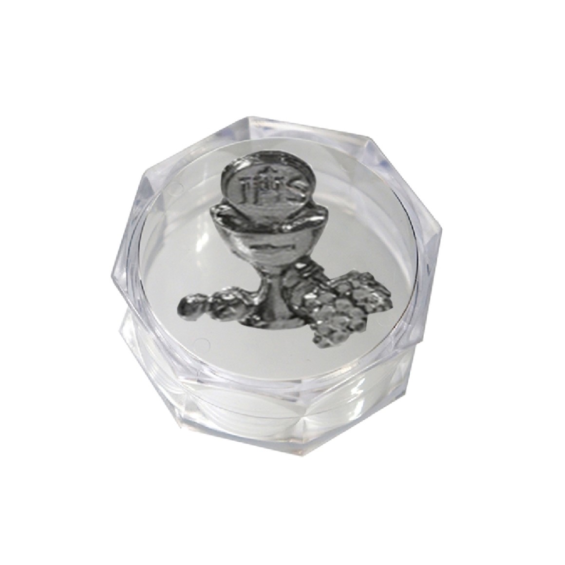 2. EM112005P6 - Caixa de Acrílico Sextavada c/ Medalha Primeira Eucaristia c/ 6un. - 3,5X3,5cm