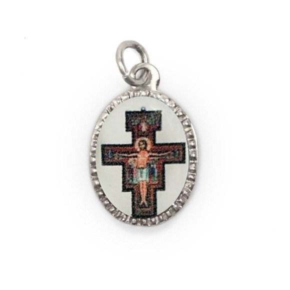 MD103888P10 - Medalha de Alumínio Oval Prata c/ 10un. Cruz de São Damião - 2X1,3cm