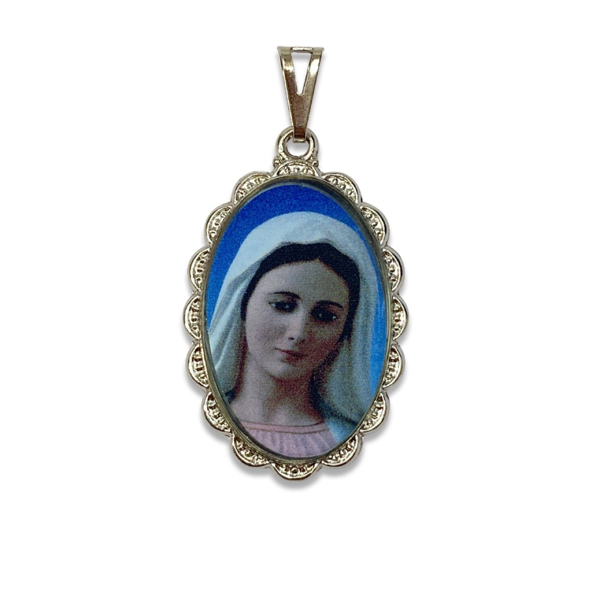 *Medalha N. Sra. Rainha da Paz Rendada Níquel - 4,2x2,5cm.