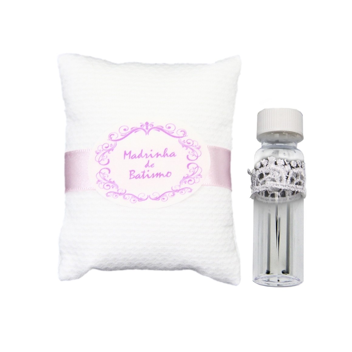 *Kit Batismo de Madrinha c/ Almofada e Vidrinho p/ Água Benta - 11x14cm.