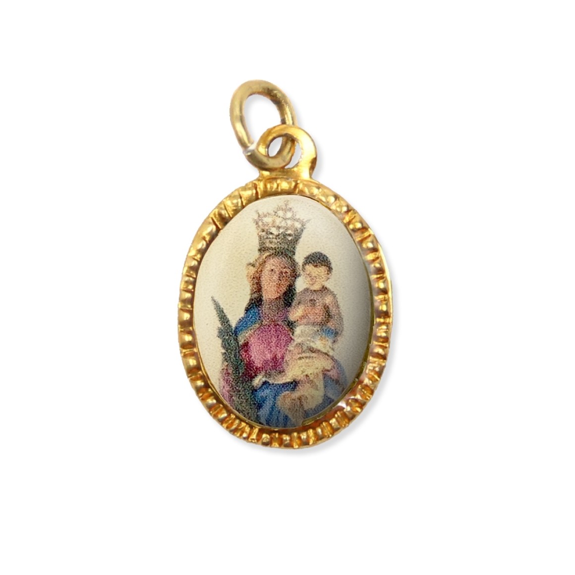 MD103118P10 - Medalha de Alumínio Oval Dourada c/ 10un. N. Sra. dos Prazeres - 2x1,3cm